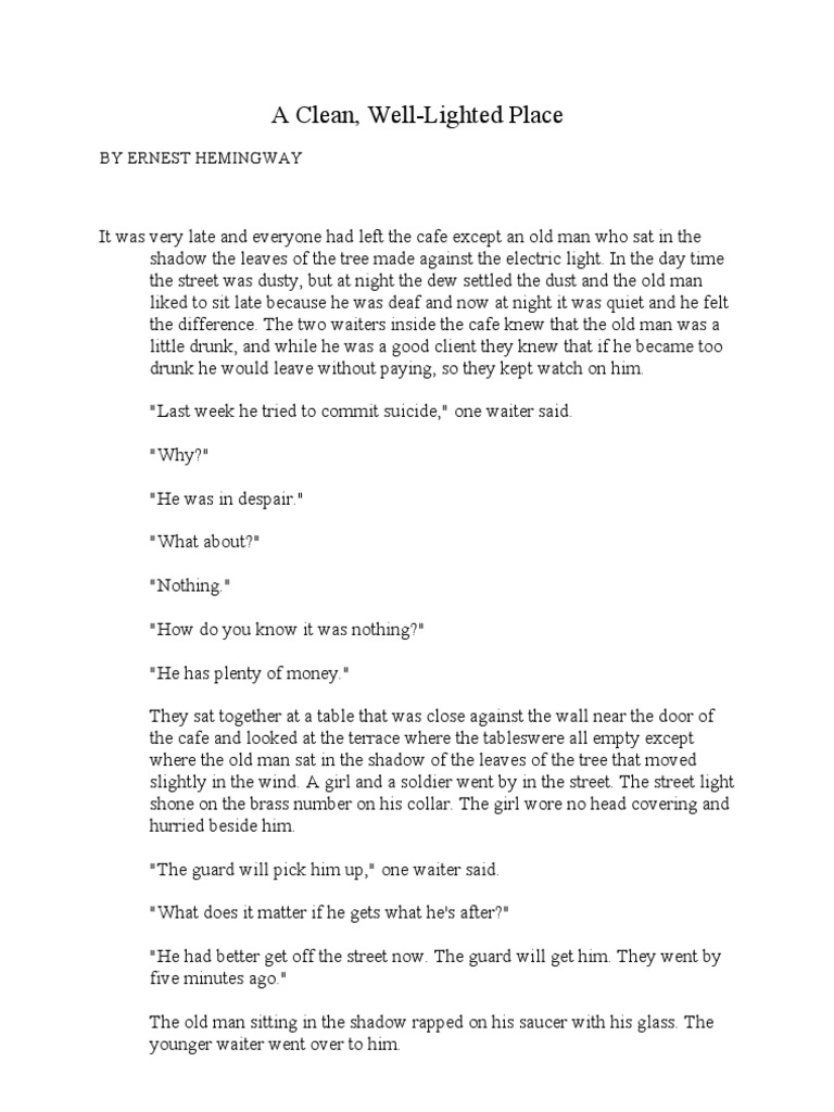 A Clean, Well-Lighted Place is a short story written by Ernest Hemingway. The main characters in the short story are two waiters and an old deaf a clean well lighted place essay. The story is set at late night in a café where the two waiters are watching the old man who is lingering on his drink. As the two waiters wait for the man to finish his drink, they engage in a conversation that brings out their views on old age and loneliness.